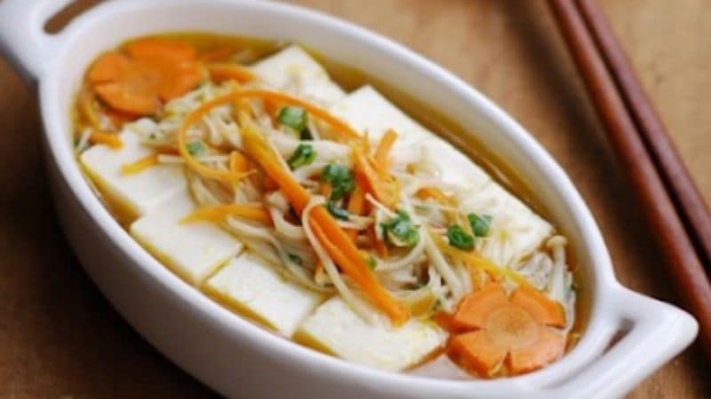 Một món chay kết hợp từ đậu hũ non và nấm kim châm, hòa cùng hương thơm của hành, tỏi phi cộng hưởng sắc cam bắt mắt của cà rốt tạo ra sự thanh đạm và tươi mát trong khẩu vị, phù hợp cho tất cả mọi người.